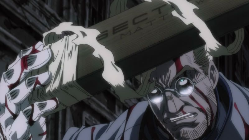 Primeiro veio o anime em 2001, produzido pelo Estúdio GONZO (que está retornando das cinzas) e que não agradou muito a todos pela forma como foi conduzido terminando numa conclusão que não lembrava em nada o clima original da série. Como o anime ficou um lixo (de enredo, a animação era boa), em 2005 a Geneon junto do Wild Geese resolveram o seguinte: “Vamos fazer de novo. Melhor, maior e mais foda”. Foi ai que veio a idéia de criar OVAS, recontando a história do mangá como ele deveria ter sido contada desde o inicio. O Estúdio escolhido para esta missão foi o Satelight que fez um trabalho bem legal do OVA 1 ao OVA 4. Fim do contrato, sai o Satelight e entra o gigante Madhouse que produziu os OVAS 5, 6 e 7, que gerou controvérsias afinal conduziram a série com certo “desleixo“. Fim de mais um contrato e para animar os OVAS 8, 9 e 10 foram chamados os estúdio Graphinica (fundado pela divisão de CG do GONZO depois da reestruturação do estúdio) e o Kelmadick, um estúdio menor que já servia como suporte para produções maiores. Agora, de casa nova mais uma vez, mas mantendo a essência original, Hellsing Ultimate segue rumo à sua conclusão. O OVA 8 foi lançado no dia 27 de julho e é sobre ele que irei comentar neste post.