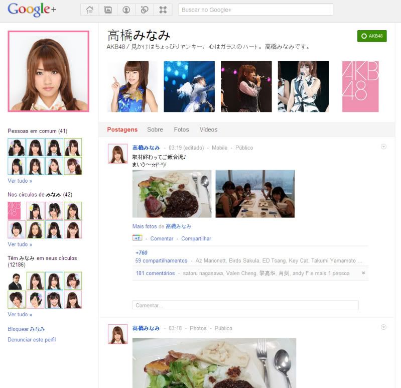 Várias akibas como a Takamina, a Acchan e a Mocchi já estão usando o serviço fazendo posts com fotos, vídeos e falando bobeiras de idol. Parafraseando a minha amiga Nadia Kaku, essa é uma “Jogada de Marketing genial que vai fazer o Google+ ganhar mais usuários nas próximas 24h do que em toda a sua existência” e é basicamente isso mesmo. Não foi difícil, durante toda essa manhã ver pessoas em posts comentando o assunto no twitter e até mesmo dentro do Google+ falando que voltariam a usar o serviço ou iriam começar a usá-lo depois deste anúncio. Eu mesmo, que mal entrava no meu perfil tratei de entrar hoje para adicionar todas as lindas em círculos e começar a acompanhar pelo feed os seus updates.
